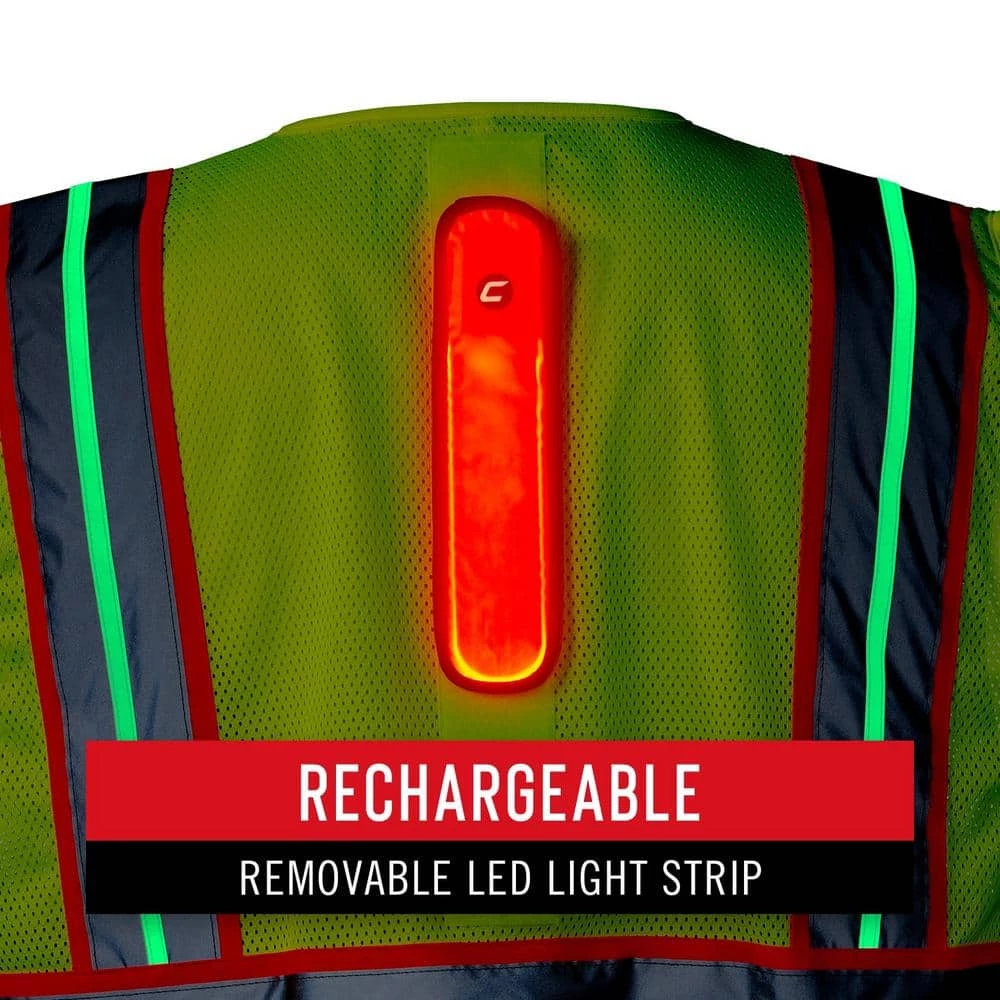 - Rechargeable LED light strip: Go brighter, go safer, go beyond hi-vis-with a rechargeable LED light strip integrated to your safety vest that plugs into micro-USB for power and can be removed from the vest when it needs a wash
