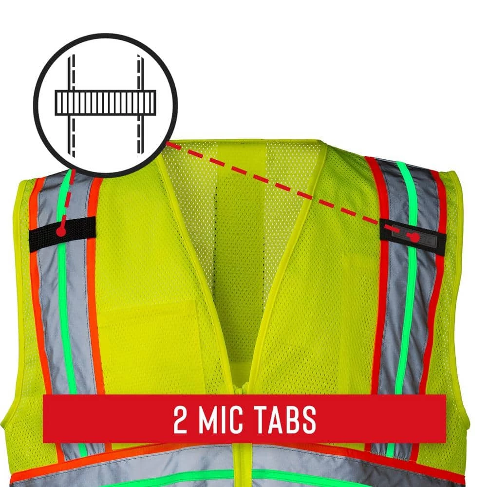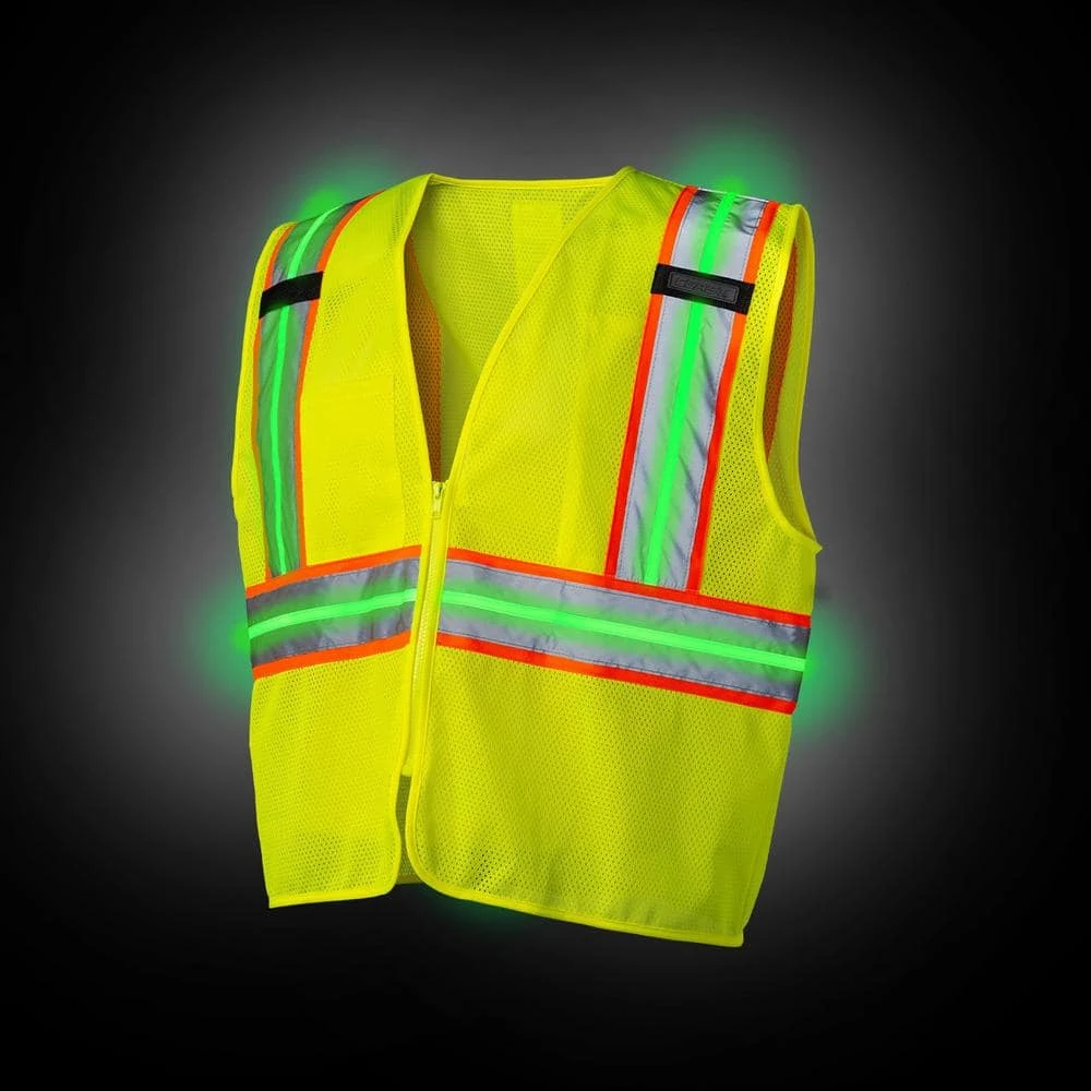Keep yourself protected with this SV400 high-vis rechargeable lighted safety vest. Yellow mesh polyester with sewn-in bands of glow-in-the-dark phosphorescent fabric recharges with any light source. A rechargeable, removable LED safety light strip and dual light modes deliver optimal visibility in lowlight settings. To provide plenty of room for smart phones, pens, notes, and other items, it comes with two shoulder-mounted mic tabs and chest pockets.