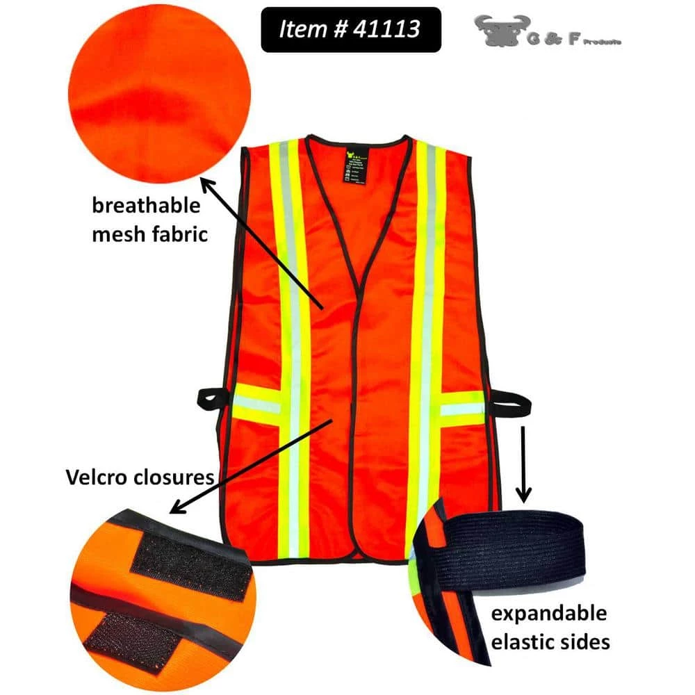 G & F Industrial Safety Vest with Reflective Strips meets all ANSI/ISEA safety standards, one size fits all, silver reflective stripes and elastic sides. It has a hook and loop closures. It is made of solid light weight material that is breathable.