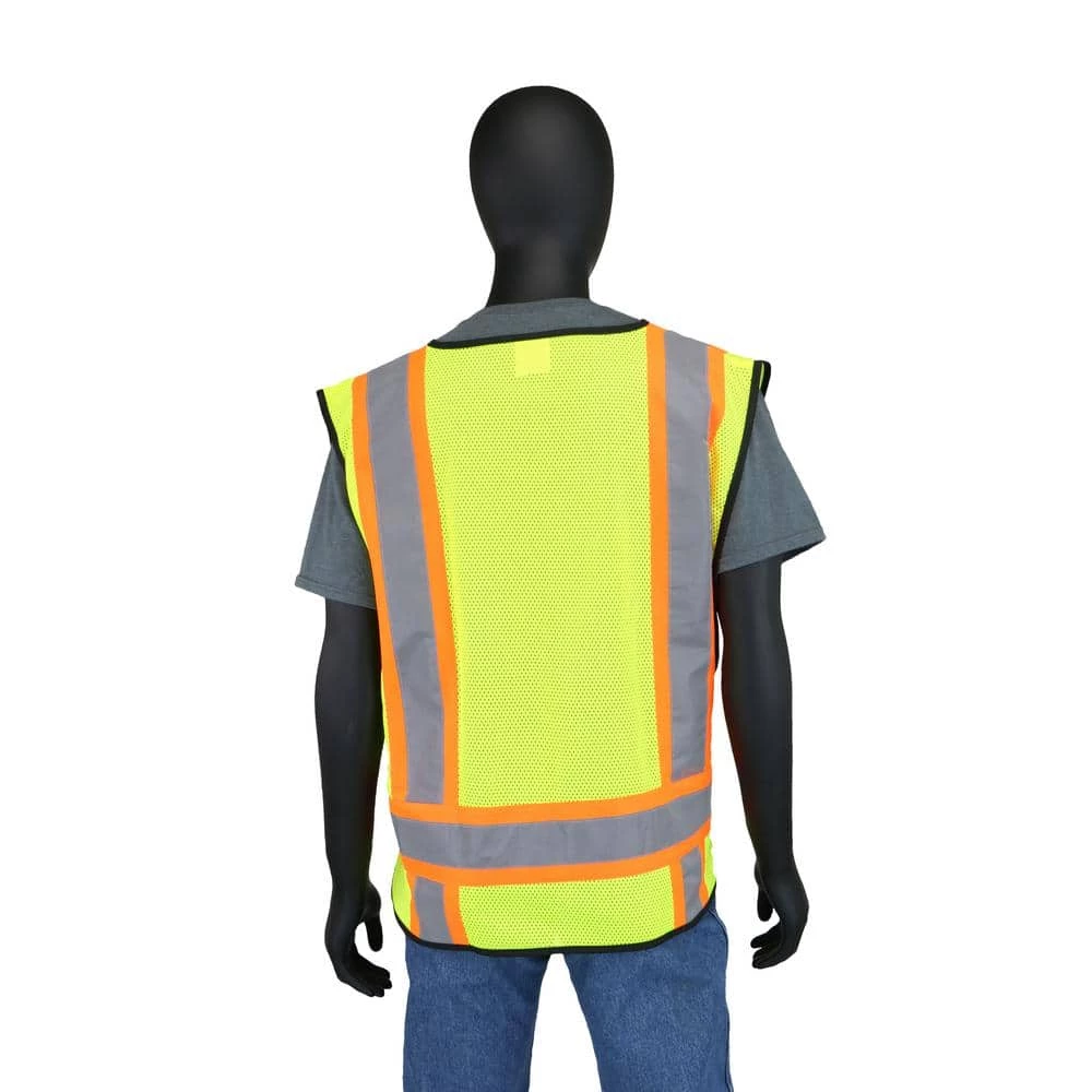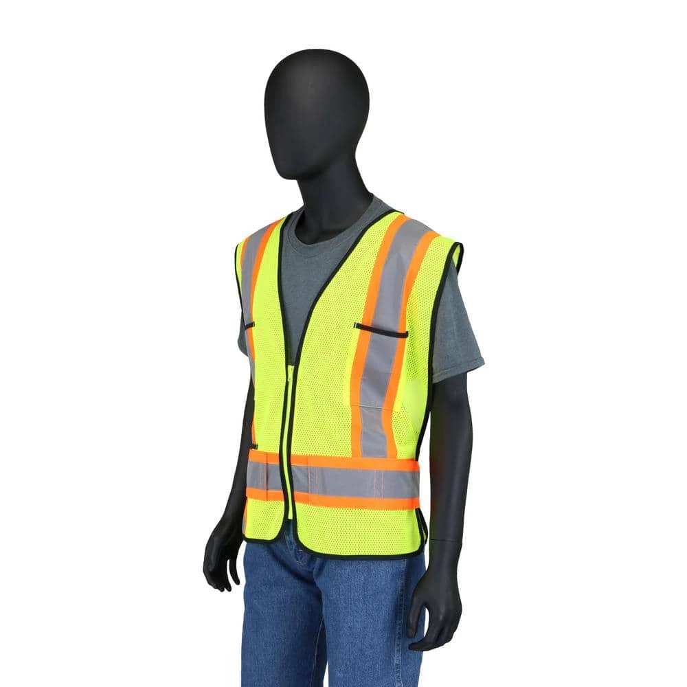 ANSI Class 2 2-tone Hi-Viz Yellow mesh vest with adjustable sides. H-Shaped 2 in. silver reflective tape and0 0.75 trim in contrasting Hi-Viz orange trim to enhance visibility. Made with breathable and lightweight mesh fabric. Adjustable break-away flaps around waist. Hi-Viz lime green zipper in the front for a secure closure with 1 interior and 1 exterior pocket.