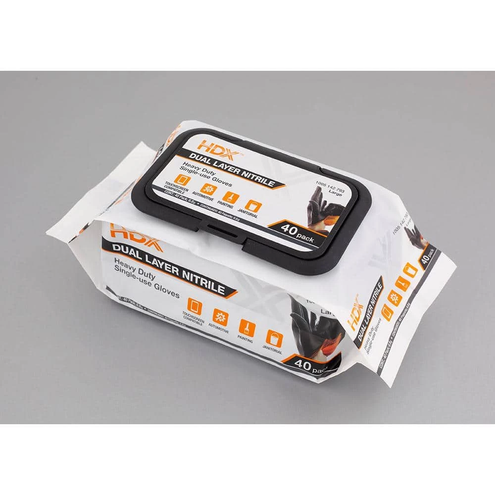 The HDX heavy duty Pop-N-Go nitrile gloves are one of a kind. This dual layer glove has an orange interior that easily exposes tears in the glove. Gloves dispense one-at-a- time, cuff first, in a convenient clean package that can be resealed and stored on the jobsite or, in a vehicle glovebox. The gloves are both powder free and latex free.
