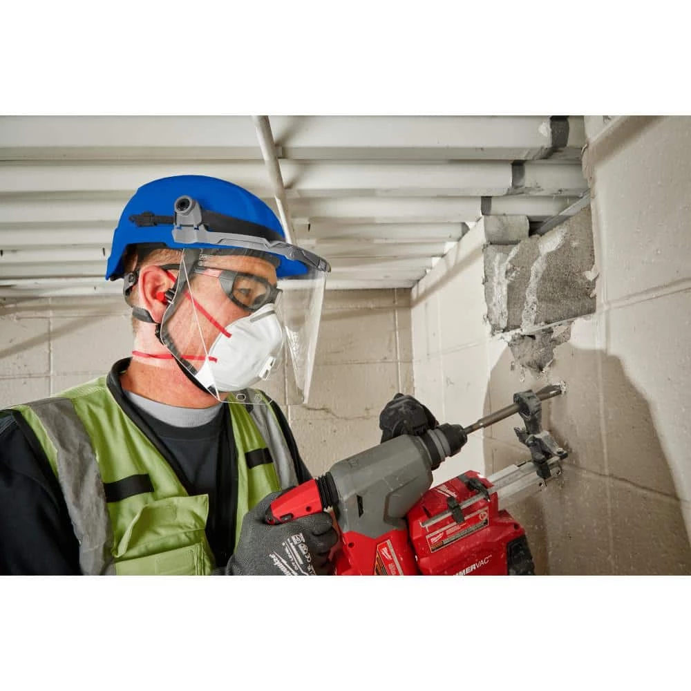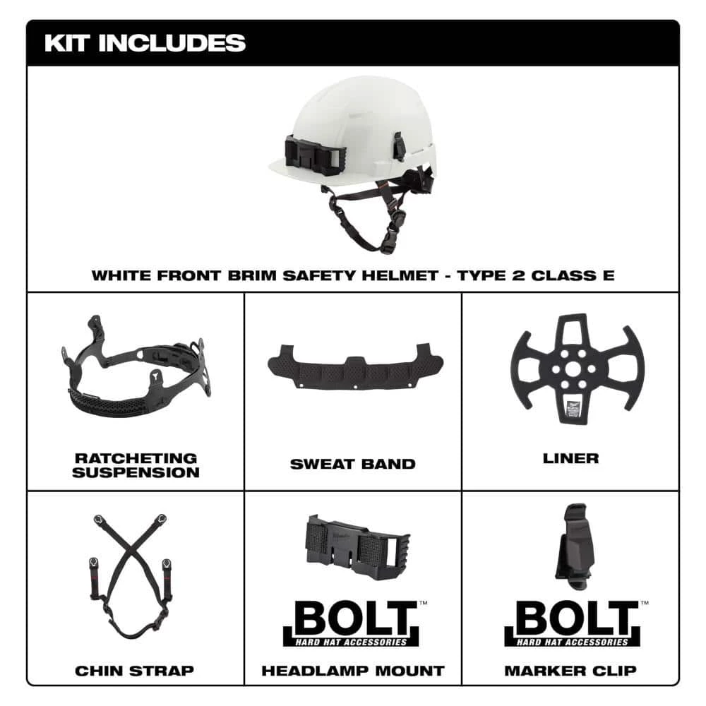 The MILWAUKEE Type 2, Class E Blue Front Brim Safety Helmet delivers users better protection and more comfort. The safety helmet offers protection from top and side impacts. These construction safety helmets are BOLT Accessory Compatible with four BOLT accessory slots and two universal accessory slots that easily integrate additional personal protection equipment and accessories so users can Secure Accessories Simultaneously. The helmet includes a BOLT Headlamp Mount that works with most headlamps for easy, secure attachment, and a BOLT Marker Clip allows for easy access to pens and markers. This Milwaukee helmet has a comfortable padded suspension that includes an adjustable swinging ratchet for better comfort. The climbing helmet style also has a comfortably fitting five adjustable buckle chin strap for better security. An antimicrobial sweatband and helmet liner prevent odor and bacteria build up and are removable and machine washable. These safety helmets are ANSI type 2 and customizable by adding a user’s logo.