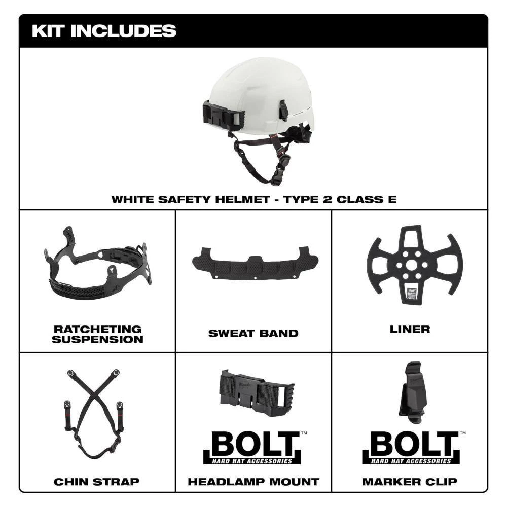 The MILWAUKEE Type 2, Class E Red Safety Helmet delivers users better protection and more comfort. The safety helmet offers protection from top and side impacts. These construction safety helmets are BOLT Accessory Compatible with four BOLT accessory slots and two universal accessory slots that easily integrate additional personal protection equipment and accessories so users can Secure Accessories Simultaneously. The helmet includes a BOLT Headlamp Mount that works with most headlamps for easy, secure attachment, and a BOLT Marker Clip allows for easy access to pens and markers. This Milwaukee helmet has a comfortable padded suspension that includes an adjustable swinging ratchet for better comfort. The climbing helmet style also has a comfortably fitting five adjustable buckle chin strap for better security. An antimicrobial sweatband and helmet liner prevent odor and bacteria build up and are removable and machine washable. These safety helmets are ANSI type 2 and customizable by adding a user’s logo.