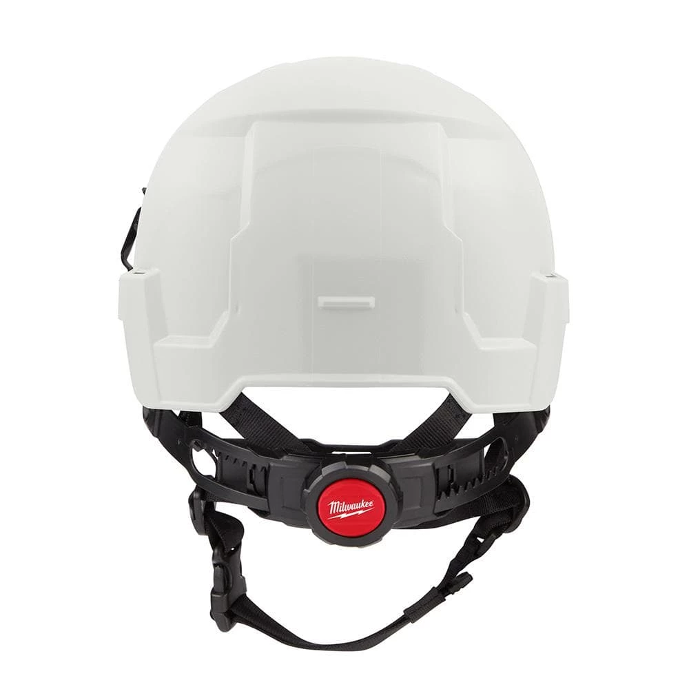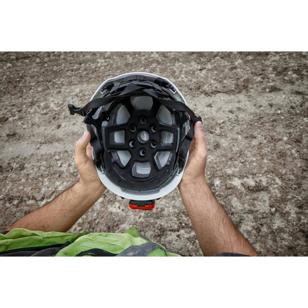 The MILWAUKEE Type 2, Class E White Safety Helmet delivers users better protection and more comfort. The safety helmet offers protection from top and side impacts. These construction safety helmets are BOLT Accessory Compatible with four BOLT accessory slots and two universal accessory slots that easily integrate additional personal protection equipment and accessories so users can Secure Accessories Simultaneously. The helmet includes a BOLT Headlamp Mount that works with most headlamps for easy, secure attachment, and a BOLT Marker Clip allows for easy access to pens and markers. This Milwaukee helmet has a comfortable padded suspension that includes an adjustable swinging ratchet for better comfort. The climbing helmet style also has a comfortably fitting five adjustable buckle chin strap for better security. An antimicrobial sweatband and helmet liner prevent odor and bacteria build up and are removable and machine washable. These safety helmets are ANSI type 2 and customizable by adding a user’s logo.