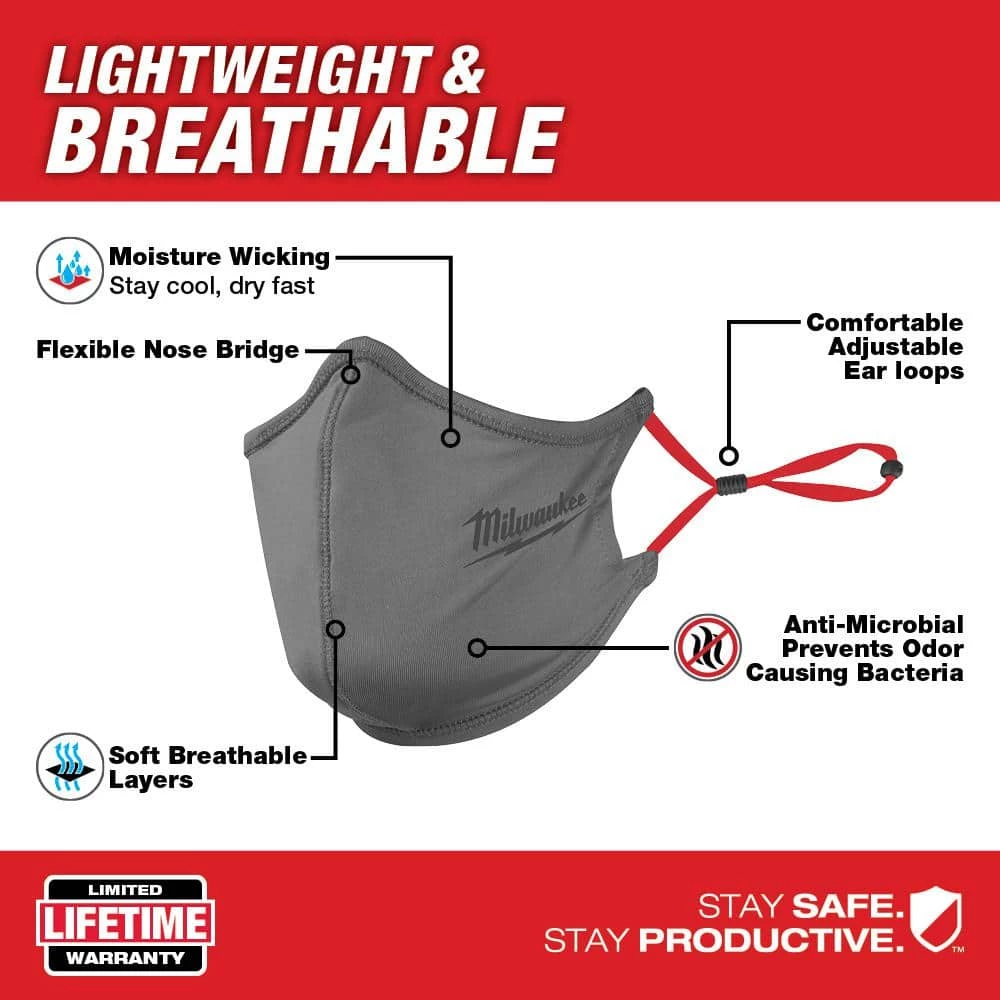 The Milwaukee Gray 2-Layer Face Mask is designed to be lightweight and breathable. This Milwaukee face mask is constructed with 2 soft, breathable layers for all day wear on the jobsite. The reusable face mask has an anti-microbial treatment that prevents odor causing bacteria. The internal layer is moisture wicking to stay cool and dry fast. The face covering has comfortable adjustable earloops and a flexible nose bridge to easily fit the user’s face. This face mask meets the CDC recommendation for a face covering.