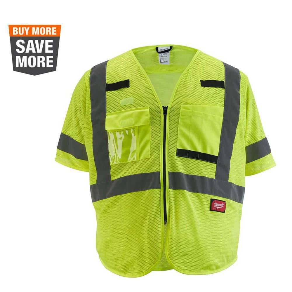 The Milwaukee L/XL Yellow ANSI Type R Class 3 High Visibility Mesh Safety Vest is designed to keep users cooler and reduce odor with moisture-wicking and anti-microbial treated fabric. This safety vest features lightweight, breathable mesh, helping users stay cooler and comfortable in hot working conditions. The high visibility mesh safety vest has 9-pockets, including a clear ID holder and an internal pocket providing users with added storage. The vest features a, quick internal size adjustment providing users with a better fit and a durable pass-through slit for fall protection gear. The zipper closure on the safety vest provides users with ultimate job site security. The Class 3 safety vest has sleeves with reflective striping to add greater visibility. Class 3 high visibility reflective vests are recommended when working in environments with traffic traveling over 50 MPH, around heavy machinery or where additional visibility is required. This includes construction, road construction, traffic direction, utility crews and survey crews.