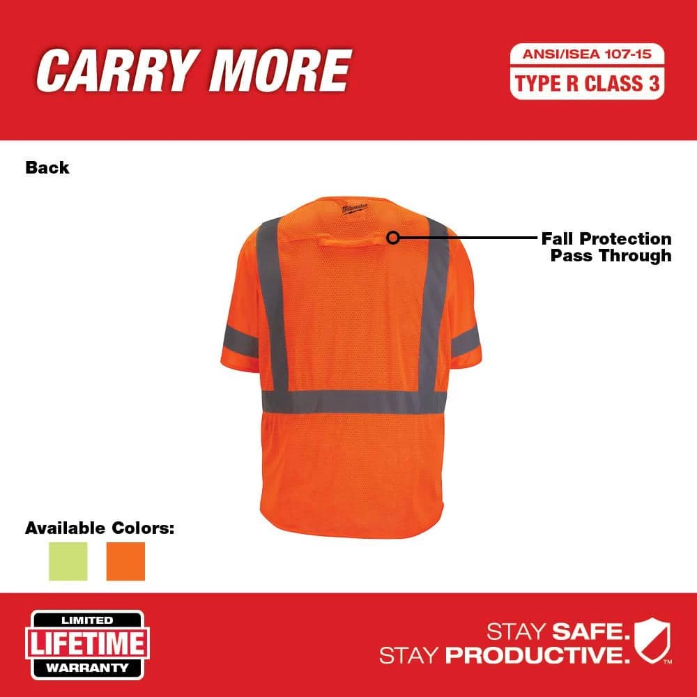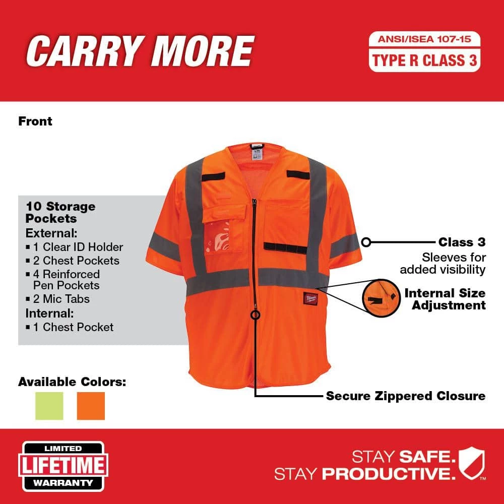 The Milwaukee S/M Orange ANSI Type R Class 3 High Visibility Safety Vest is designed to carry more. The high visibility safety vest has 10 pockets, including a clear ID holder and an internal pocket for additional storage. The hi-vis safety vest features a quick internal size adjustment, providing users with a better fit as well as a durable pass-through slit for fall protection gear. The size adjustment allows the vest to be worn in the summer over a t-shirt or in the winter over a jacket. The zipper closure on the safety vest delivers users ultimate jobsite security. The Class 3 safety vest has sleeves with reflective striping to add greater visibility. Class 3 high visibility reflective safety vests are recommended for users working in environments with traffic traveling over 50 MPH, around heavy machinery or in applications requiring additional visibility. This includes construction, road construction, traffic direction, utility crews and survey crews.